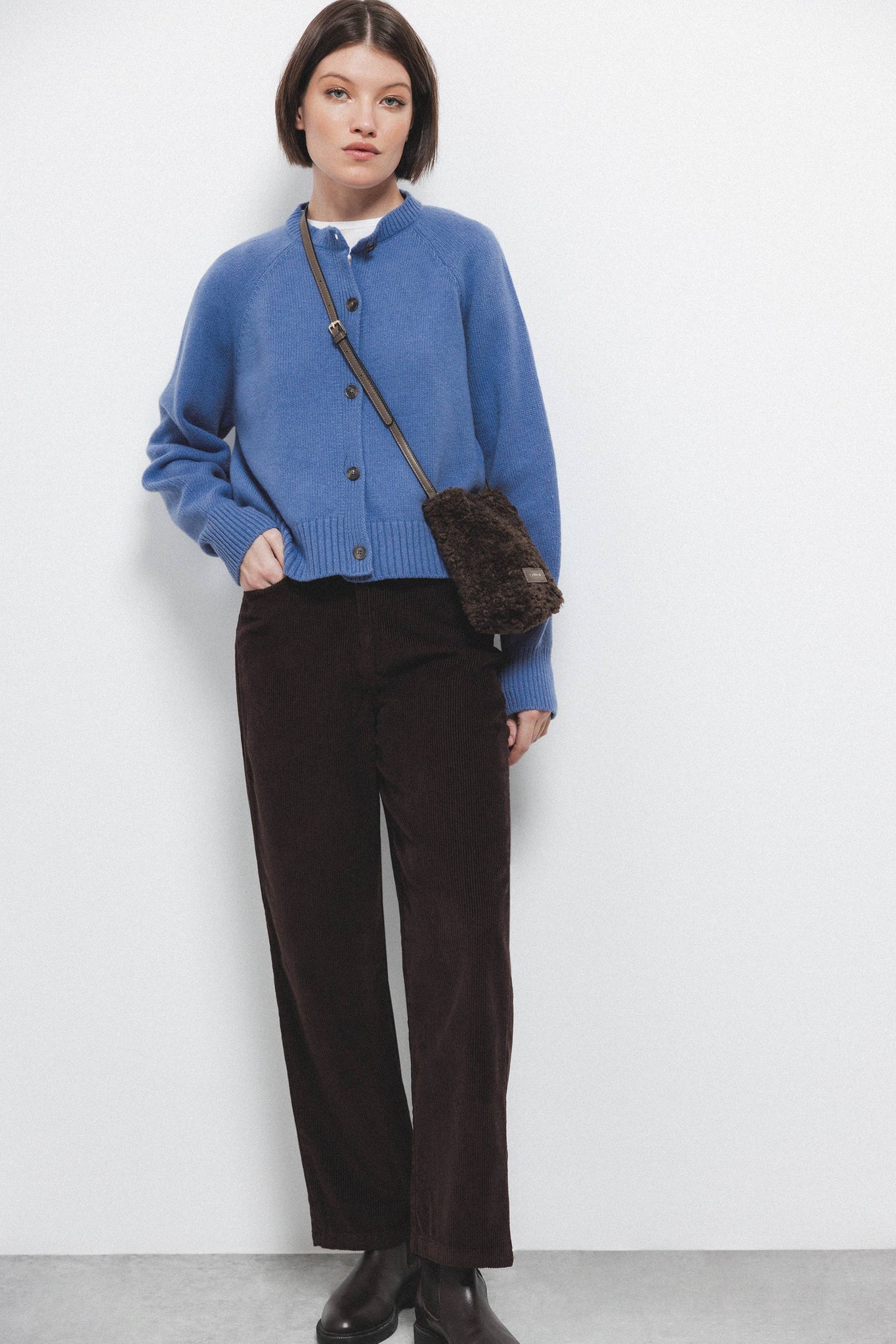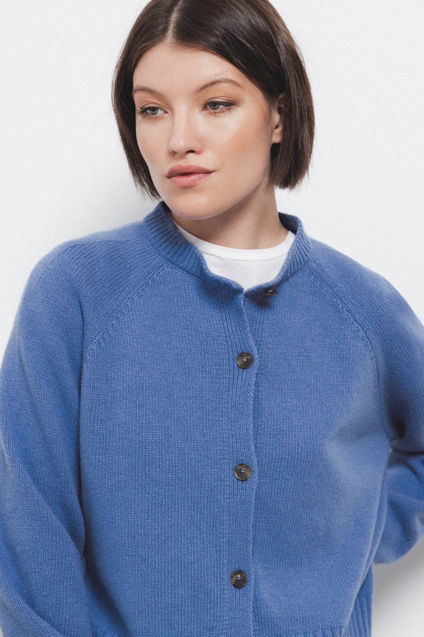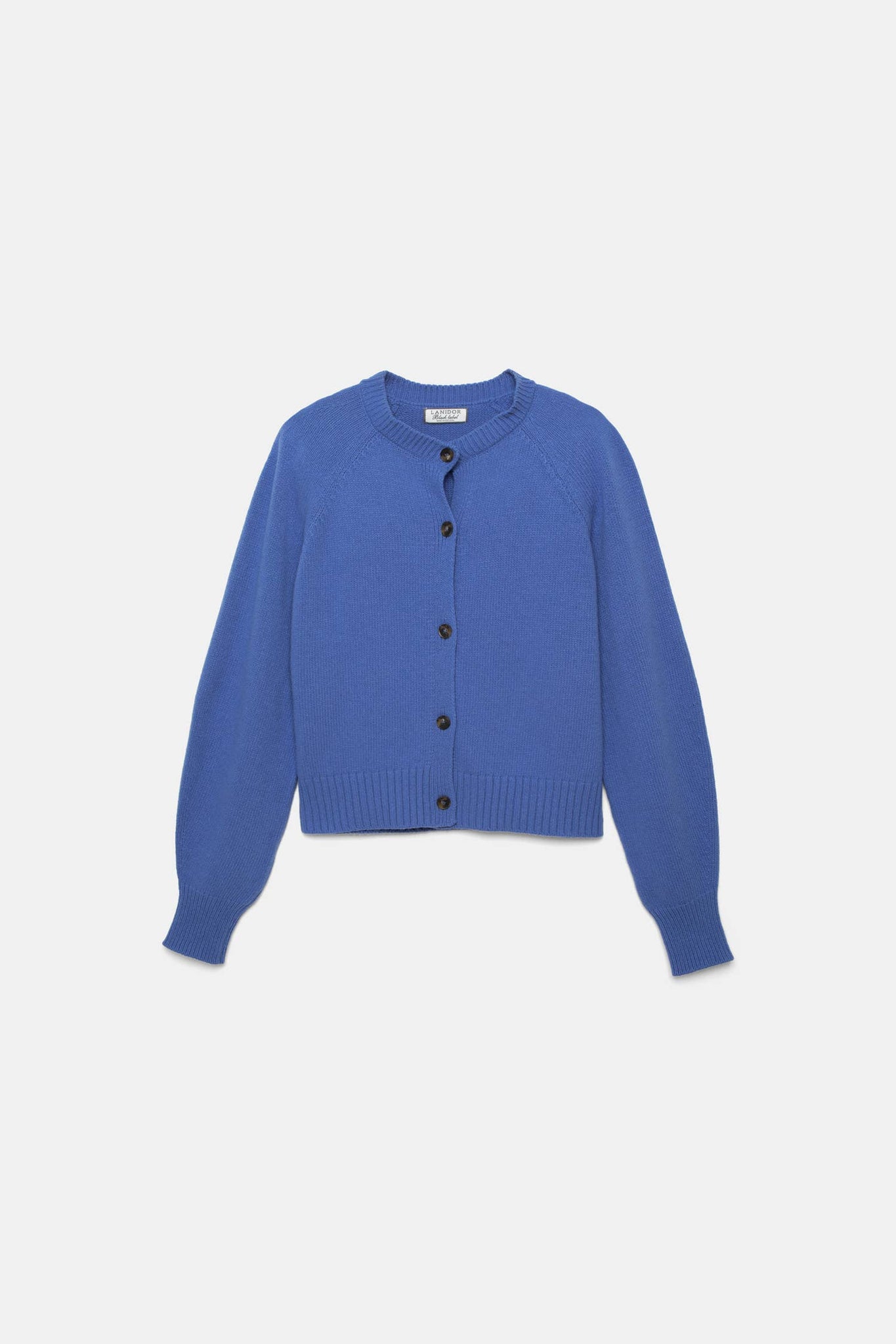 Gilet en maille unie avec encolure ronde et manches longues. Ouverture frontale avec fermeture par boutons de couleur contrastante. Finitions côtelées sur les poignets hauts, l'encolure et l'ourlet.