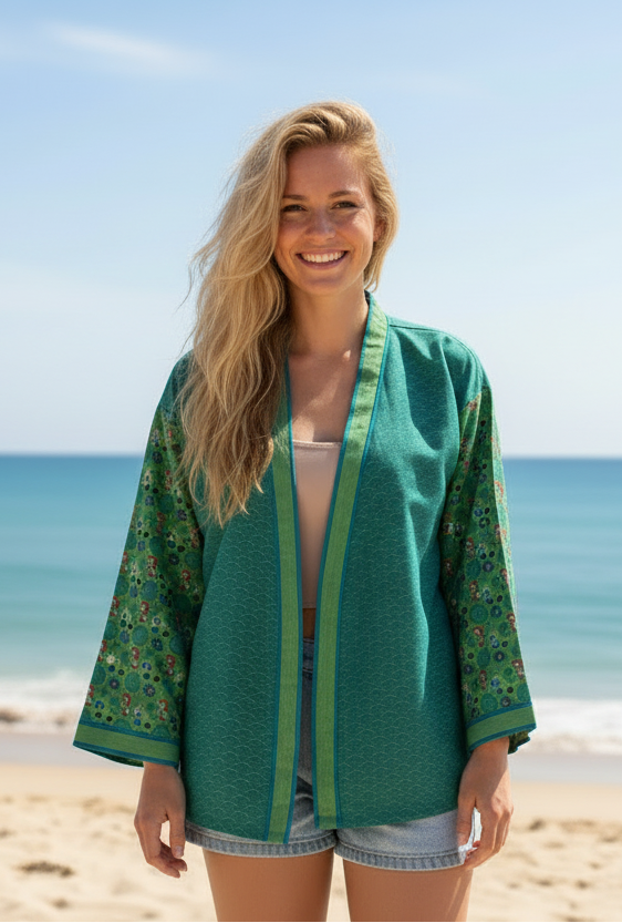Nos kimonos 100% coton Bio, bénéficient d’une qualité exceptionnelle grâce au tissage qui apporte une légèreté et une douceur très agréable. L’impression artisanale procure des couleurs profondes et subtiles. Nos kimonos sont vendus en taille unique. Ils peuvent être portés à la plage par-dessus un maillot de bain ou en chemise légère en été. La qualité du coton est exceptionnelle, un tissu léger et d’une douceur très agréable. 100% coton Bio Dessiné à la main en France Imprimé à la main en Inde Kimono en coton biologique. Taille unique, 75 cm de hauteur, 60 cm de largeur, convient aux tailles S à L.