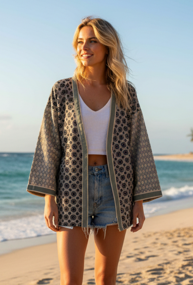 L’impression artisanale procure des couleurs profondes et subtiles. Nos kimonos sont vendus en taille unique. Ils peuvent être portés à la plage par-dessus un maillot de bain ou en chemise légère en été.