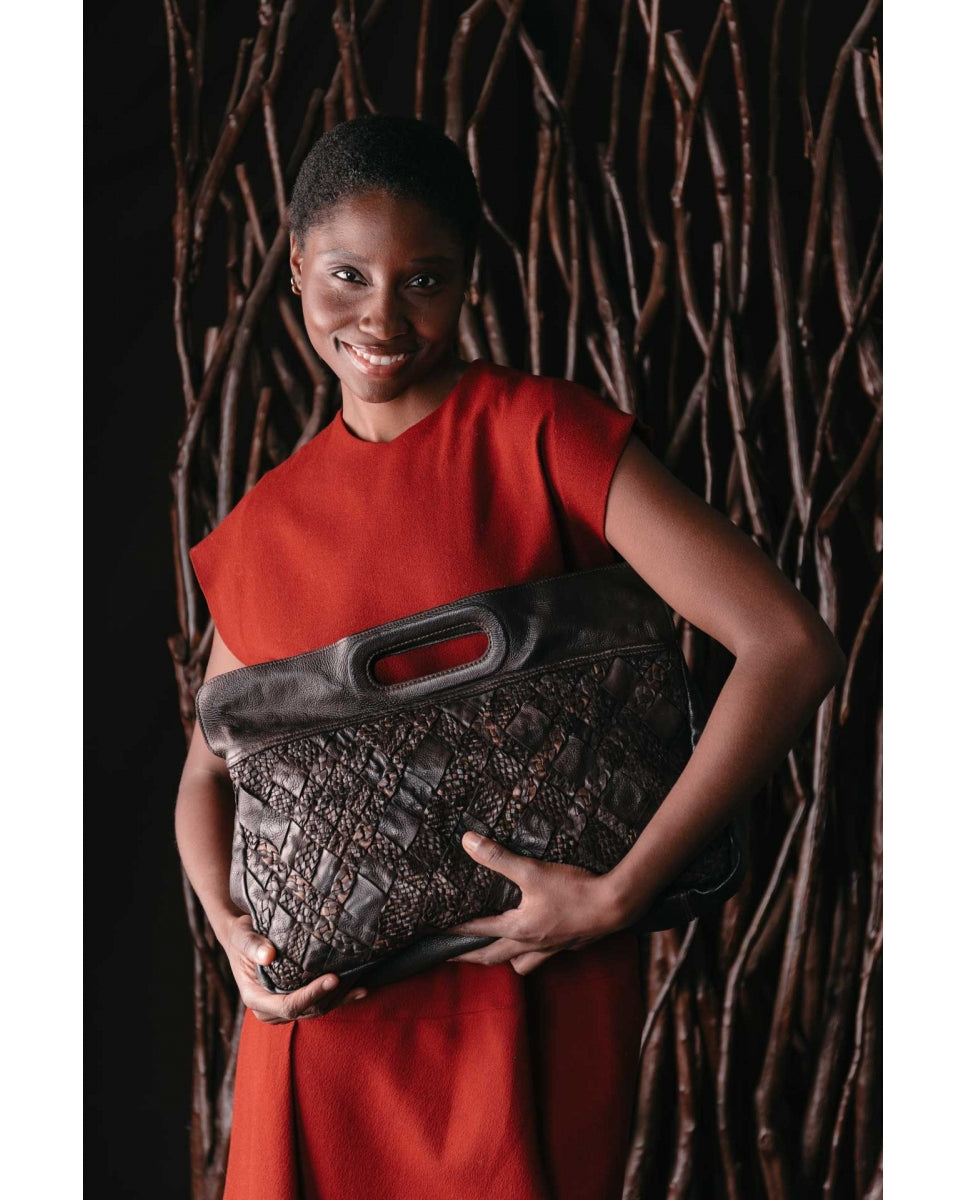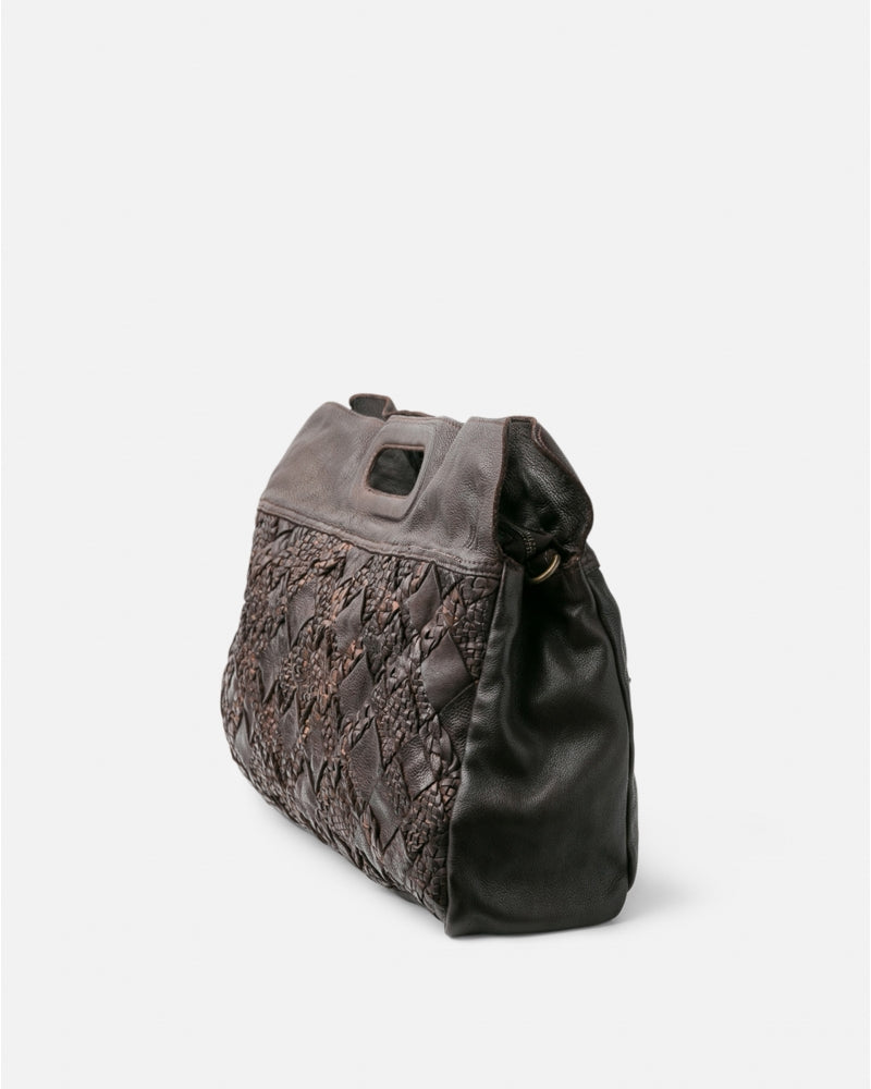 Grand cabas en cuir lavé, tressé. Les différentes techniques de tresse sur le devant se démarquent. Poignée main et bandoulière réglable et amovible. Fermeture zippée. Deux compartiments internes. Plusieurs poches externes et internes. Doublure en coton.