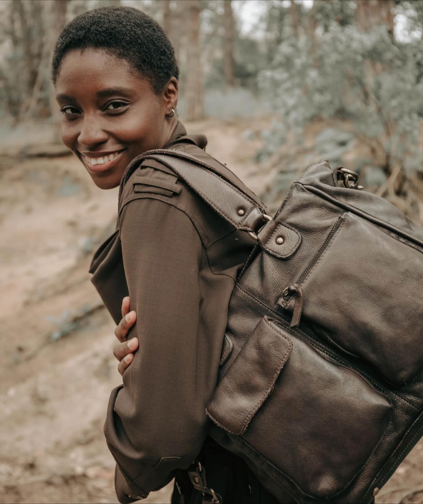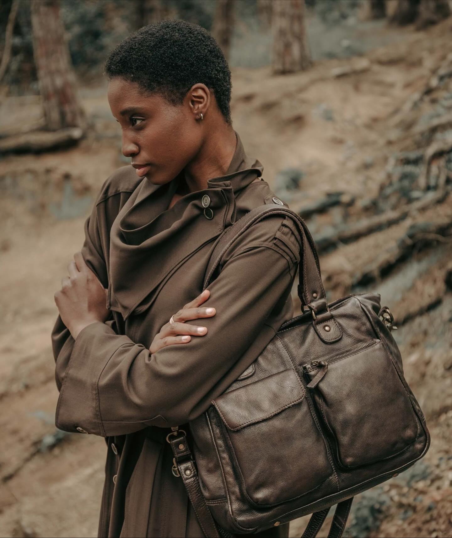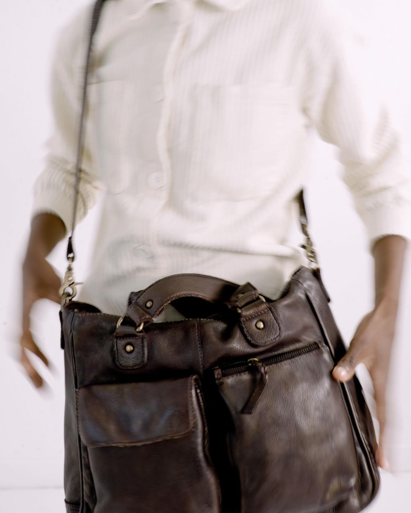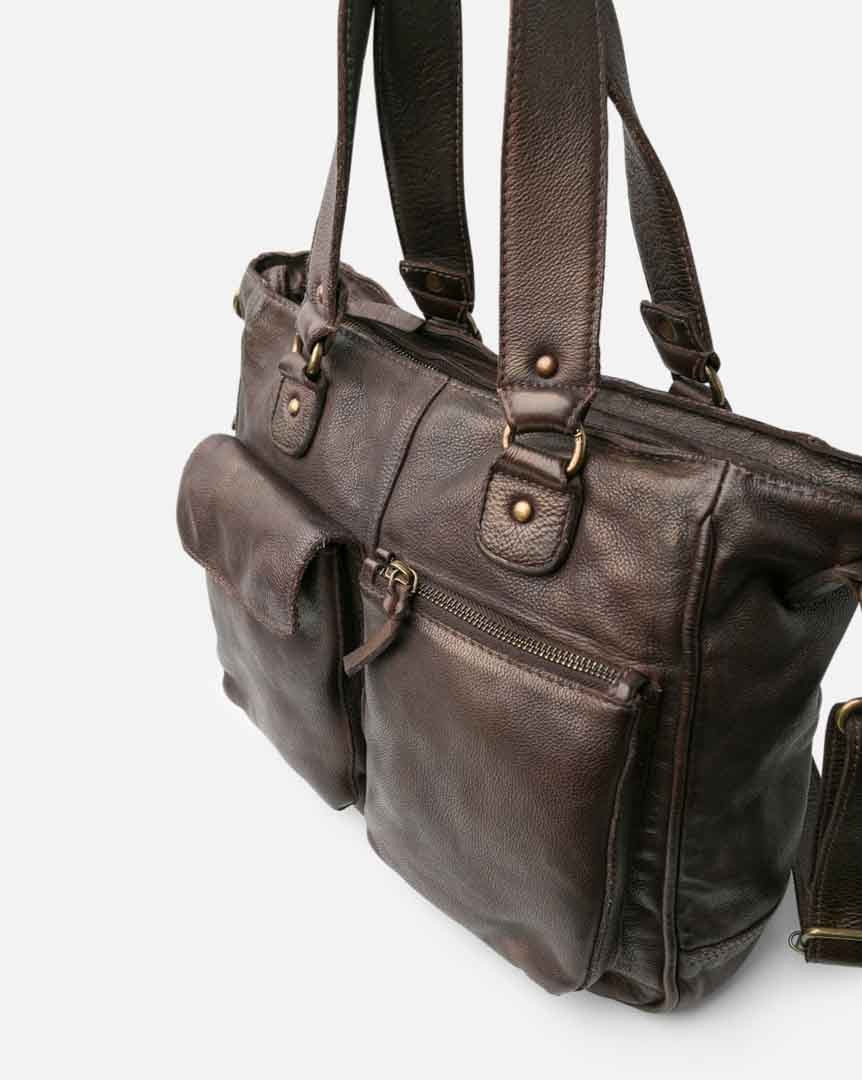 Sac cartable en cuir de vache lavé avec un effet nacré. Des bretelles. Fermeture zippée. Bandoulière réglable et amovible. Plusieurs poches externes et internes. Doublure en coton.