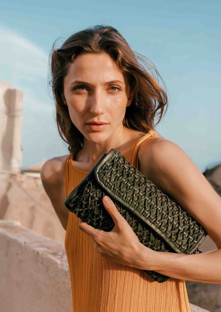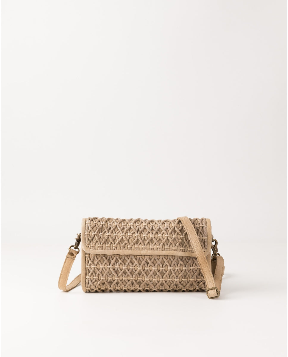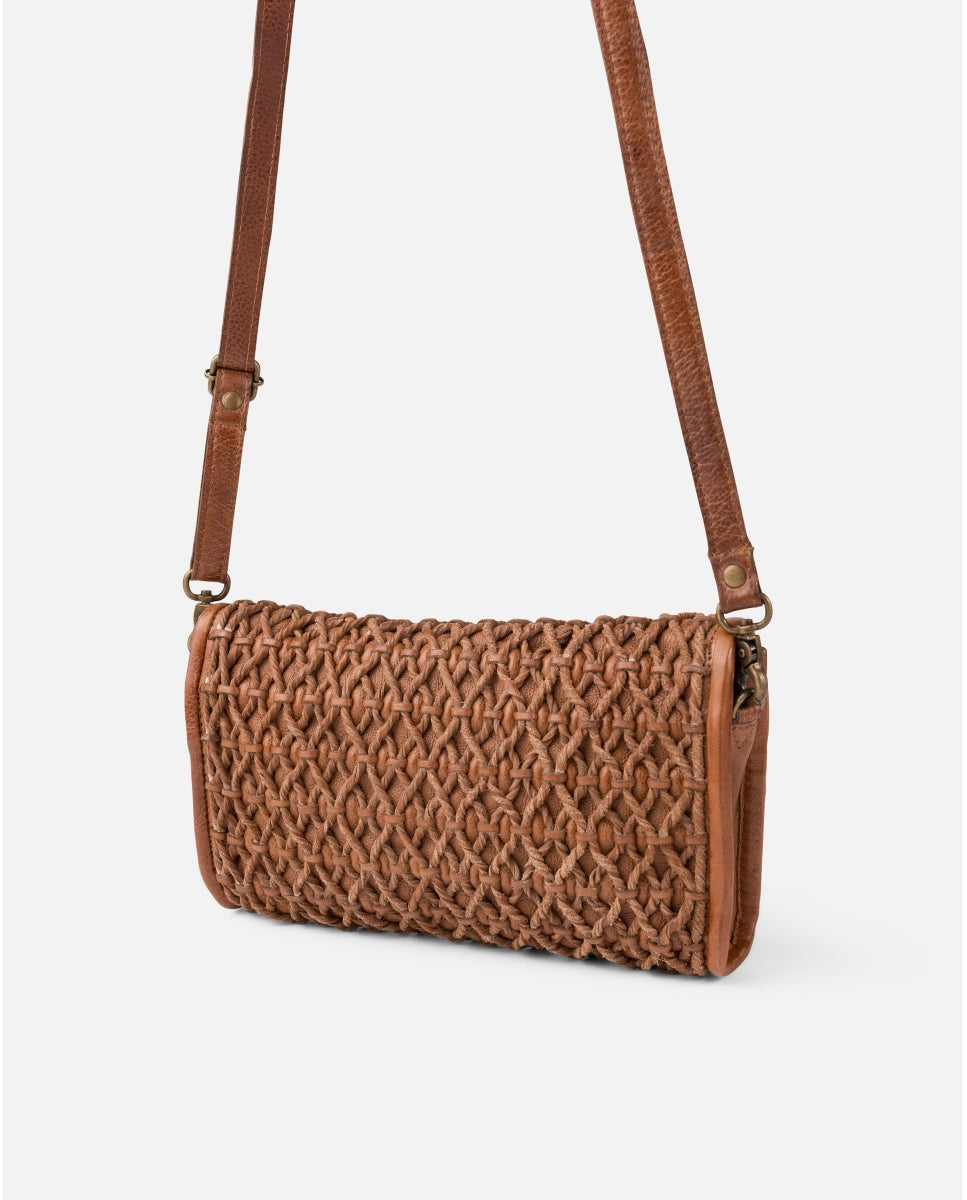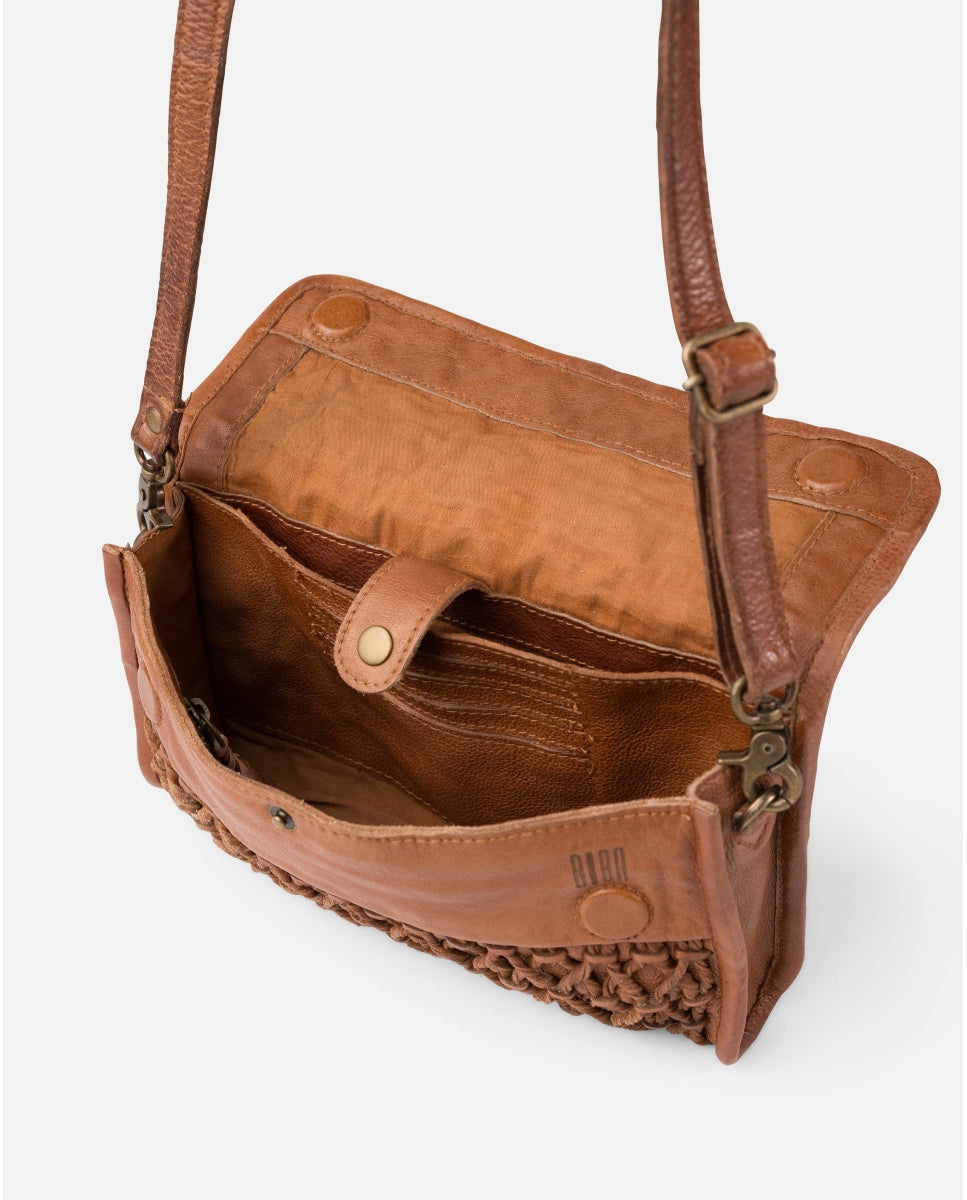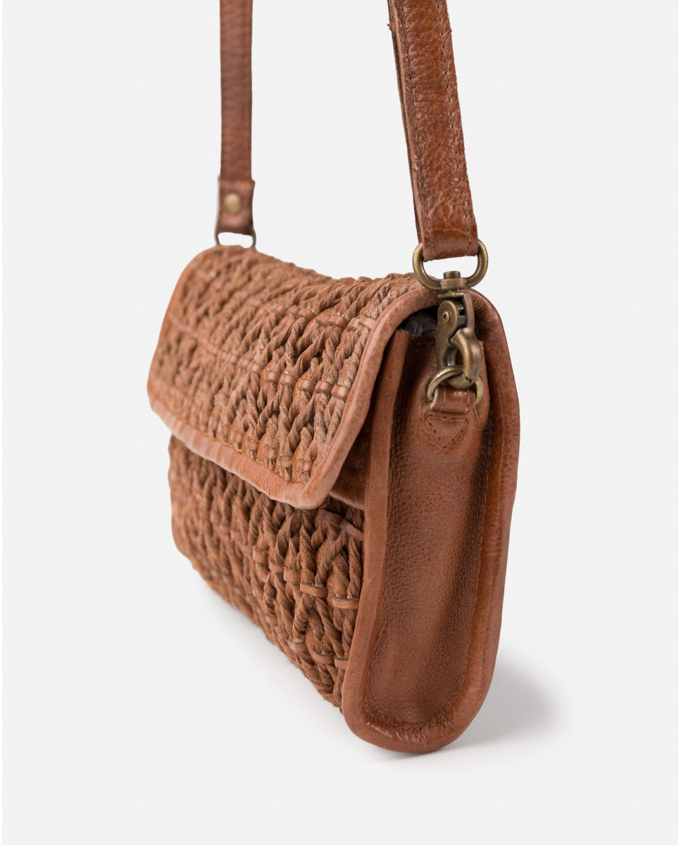 Pochette sac à bandoulière en cuir lavé, roulé et tressé. Fermeture à rabat avec deux aimants et pression interne. Bandoulière réglable et amovible. Plusieurs poches internes. Doublure en coton.