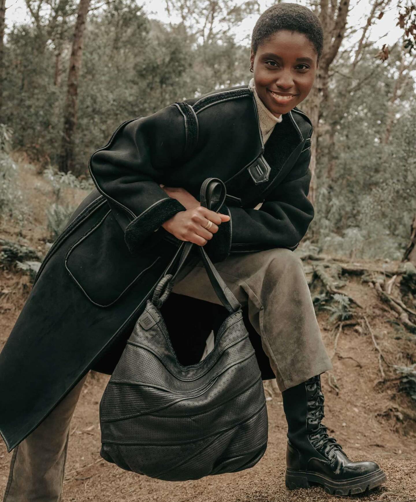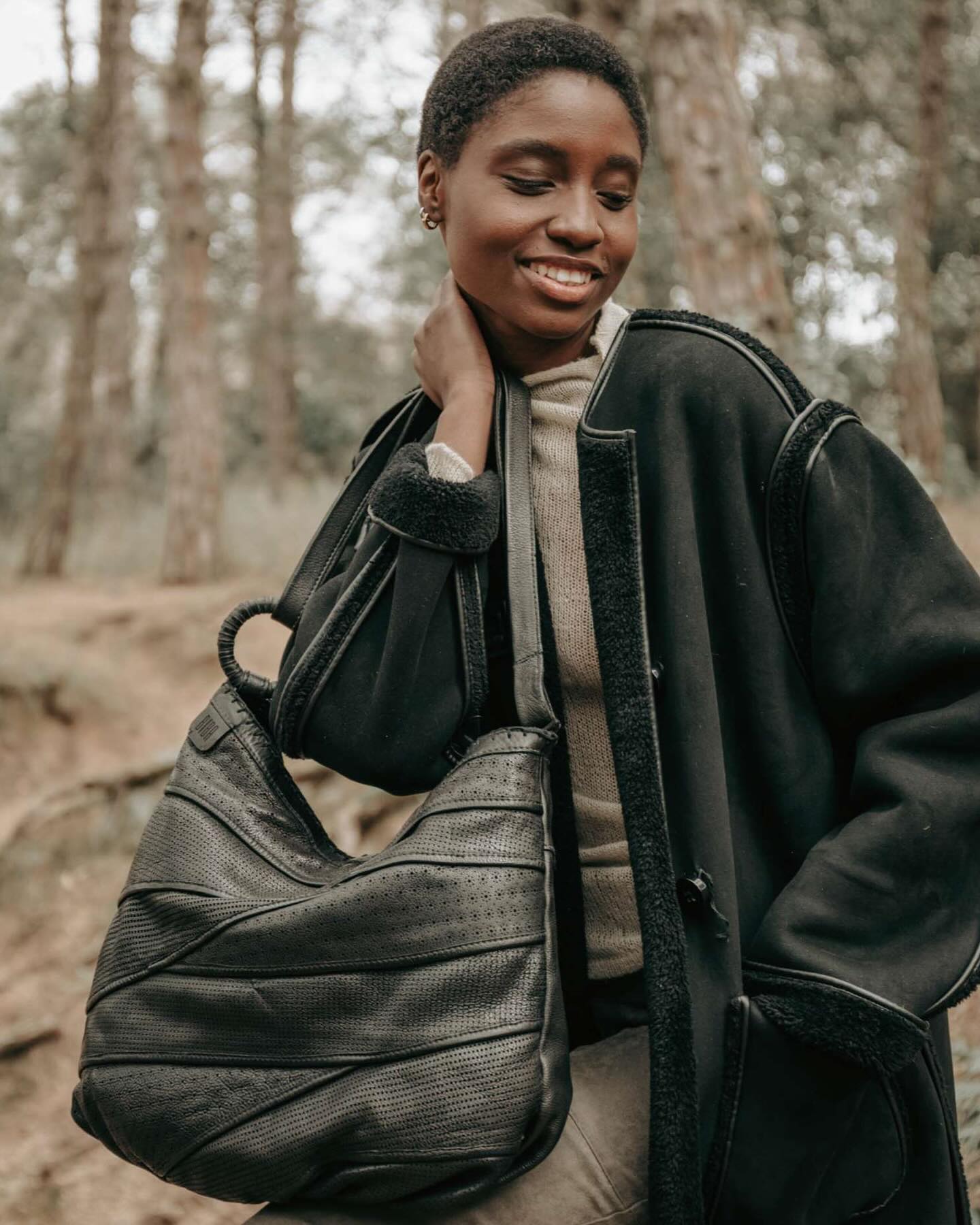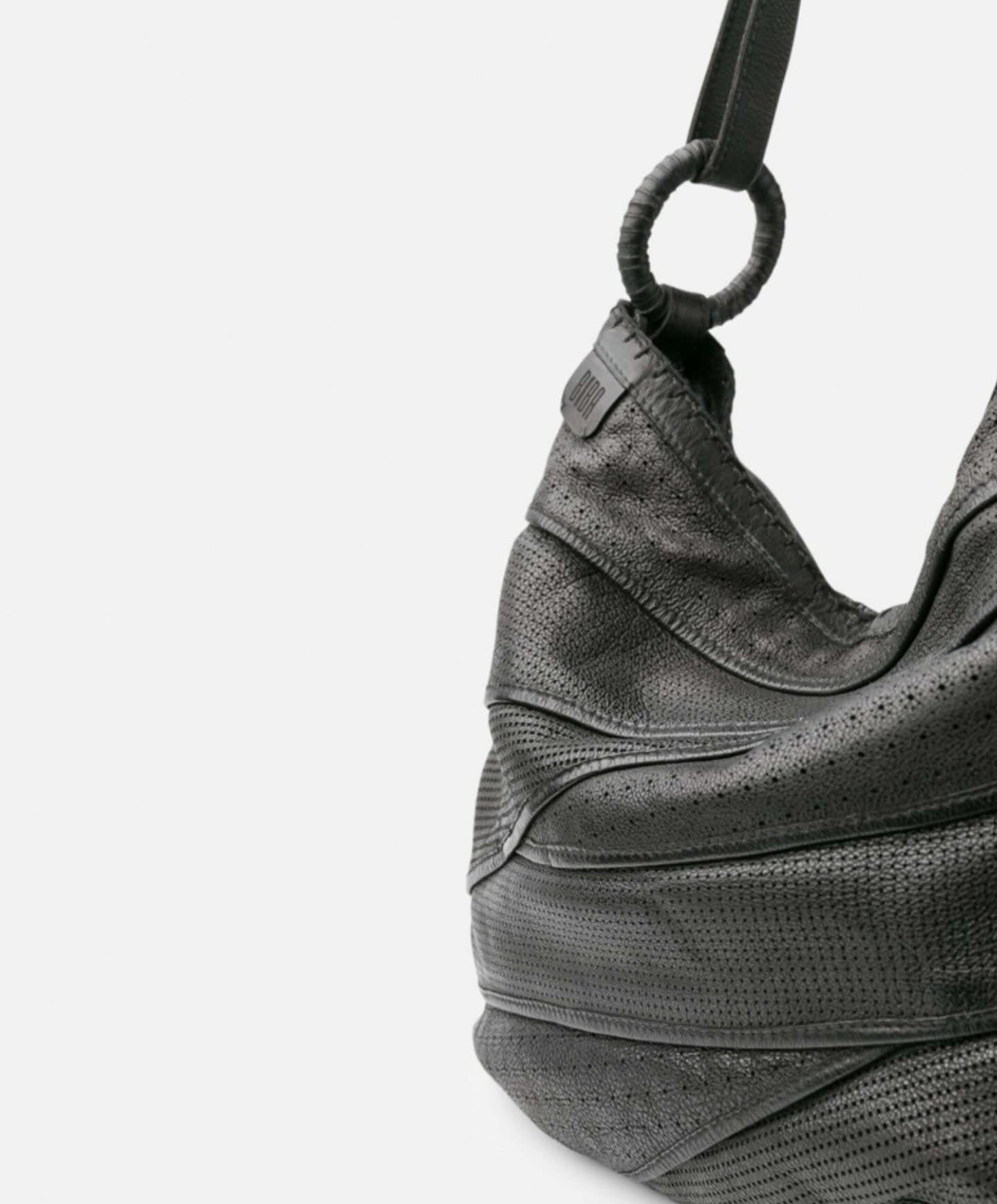 Hobo en cuir lavé. Patchwork poinçonné de motifs différents. Poignée multiposition qui vous permet de la porter à l'épaule ou en porté travers. Fermeture zippée. Poches externes et internes. Doublure en coton.