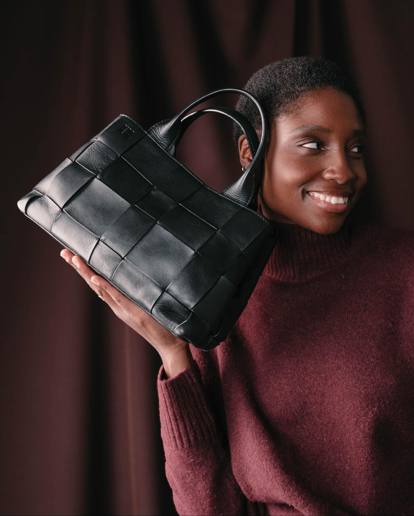 Sac cabas forme bowling en cuir de vache lavé et tressé des deux côtés. Poignées. Bandoulière d'épaule réglable et amovible.